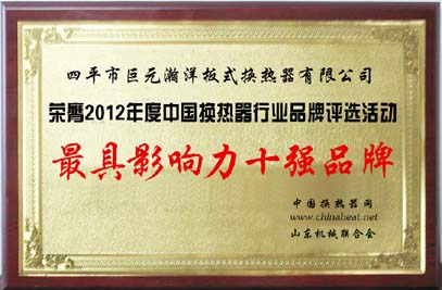 巨元公司榮獲2012中國換熱器十強品牌評選第一名
